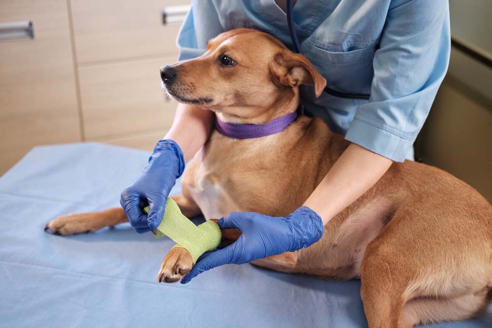 Veterinarian wraps a bandage around the damaged paw in clinic, health care. Close up shot